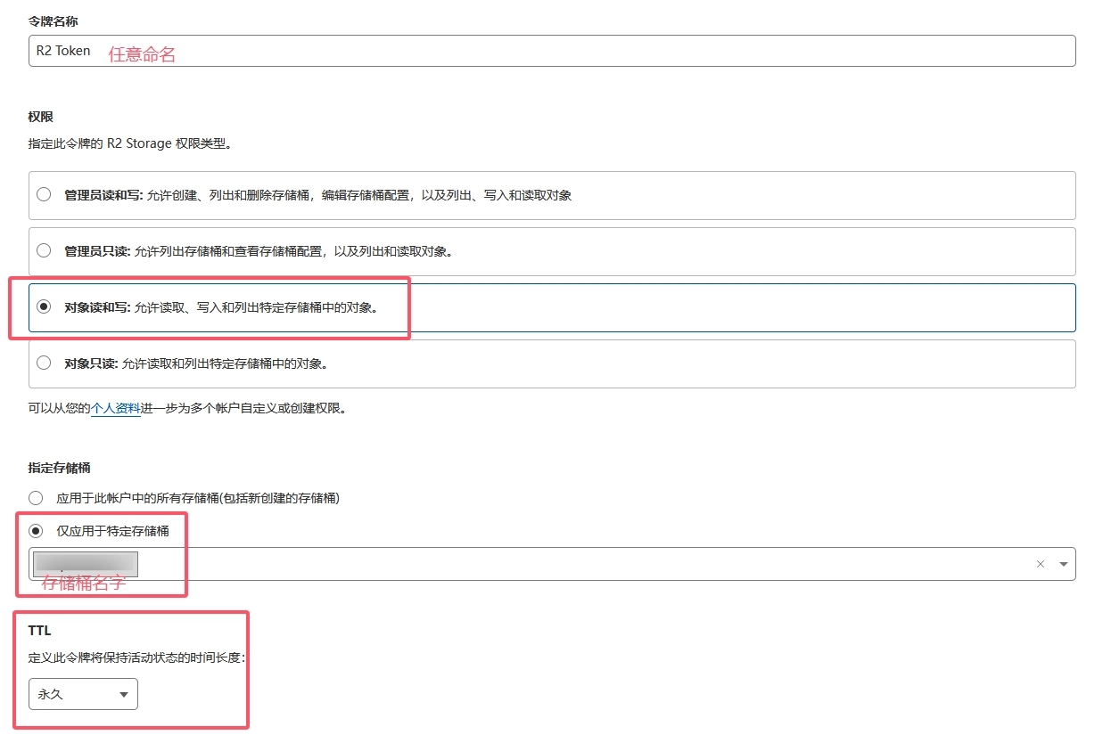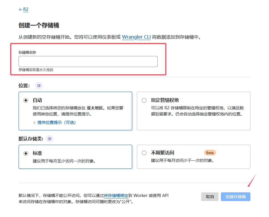 输入你喜欢的名字命名你的存储桶,然后完成创建【其他选项不更改】