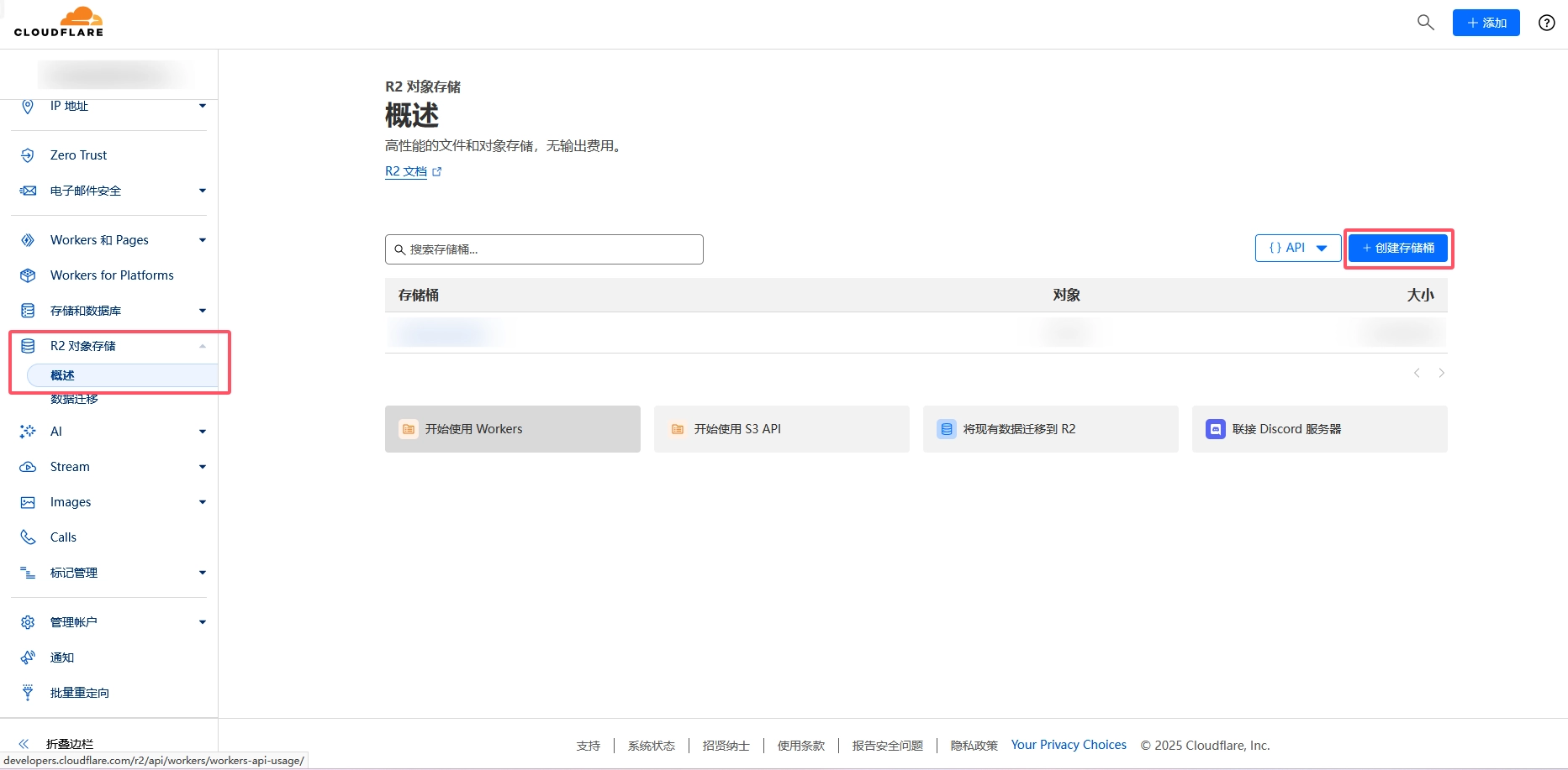 首先进入你的Cloudflare面板 在左侧菜单中选择R2对象存储,进入后点击创建